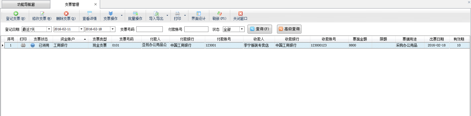 支票管理功能主要包括登記支票、修改支票、刪除支票、查看支票詳情、導入導出支票數據、打印支票、刷新支票列表。