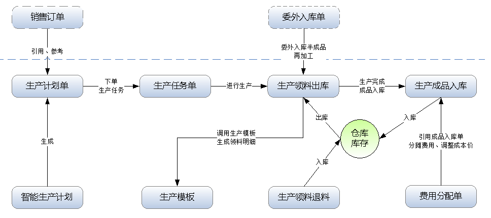生產管理功能主要包括:生產模板、生產計劃單、生產任務單、生產領料出庫單、生產成品入庫單、生產退料入庫單及智能生產計劃。
