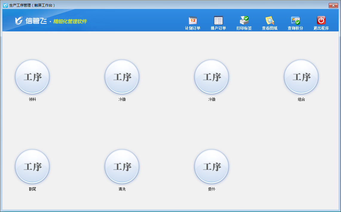 生產(chǎn)工序管理(觸屏工作臺)為整個生產(chǎn)過程中各工序?qū)嶋H操作界面,請按照工令單設置的生產(chǎn)工序流程進行生產(chǎn)。